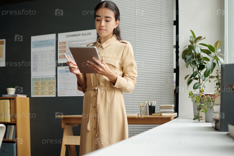 Молодая серьезная учительница в бежевом платье смотрит на экран планшета