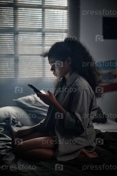 Стрессованная молодая девушка в серой рубашке, сидящая на коленях на двуспальной кровати