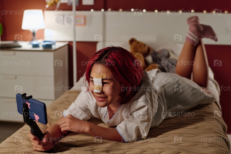 Счастливая девочка-подросток смотрит на экран смартфона в больничном отделении