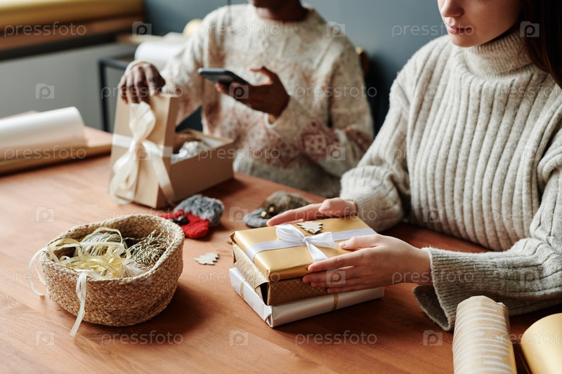 Молодая женщина держит кучу подарков