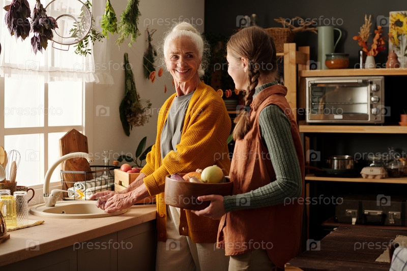 Счастливая пожилая женщина смотрит на свою внучку с миской спелых овощей