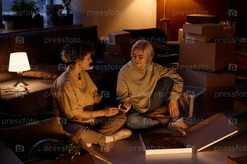 Молодые девушки едят пиццу после переезда