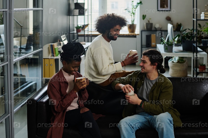 Три молодых дизайнера пьют кофе