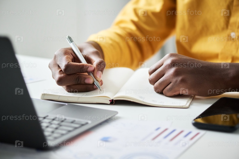 Рука молодого афроамериканского предпринимателя с ручкой над открытым блокнотом