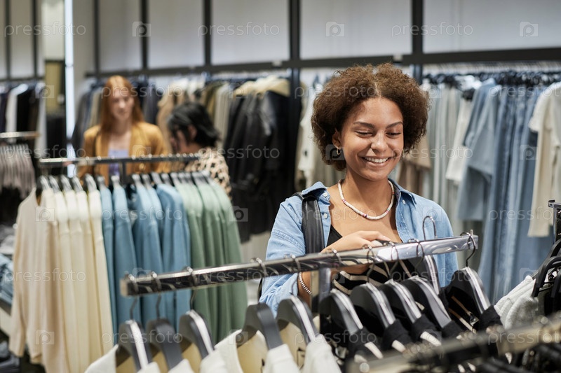 Девушка, выбирающая одежду из железной дороги в магазине