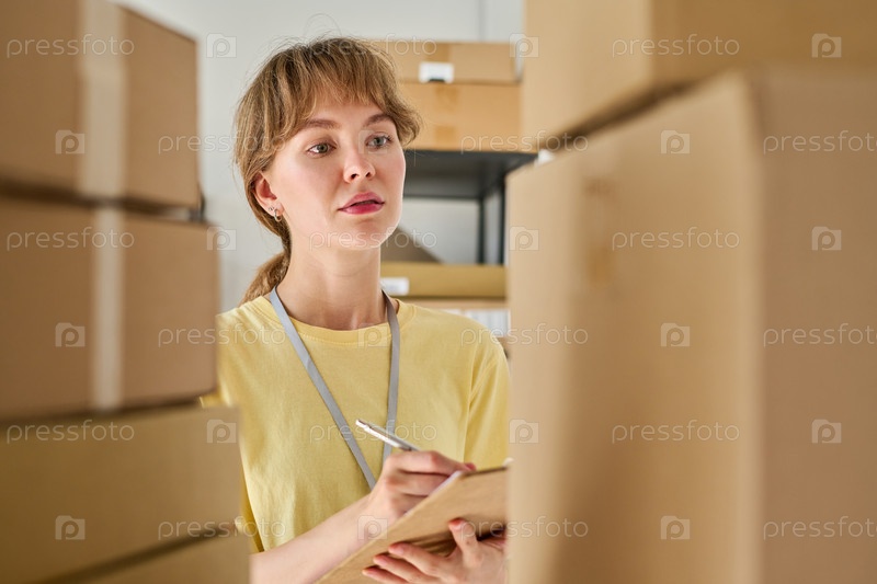 Молодая серьезная женщина делает заметки в документе, глядя на кучу ящиков