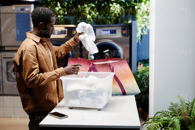Боковый вид молодого человека в бежевой рубашке, кладущего сморщенную одежду в контейнер