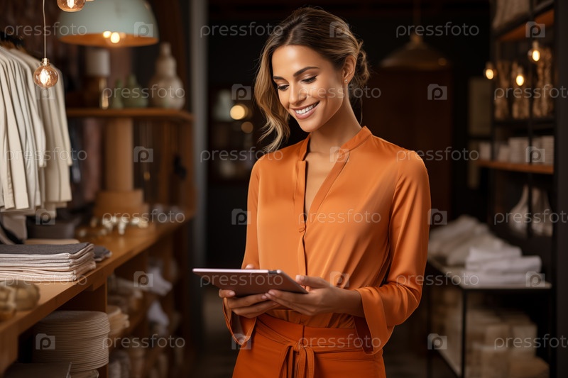 Владелец магазина одежды работает на планшетном компьютере AI