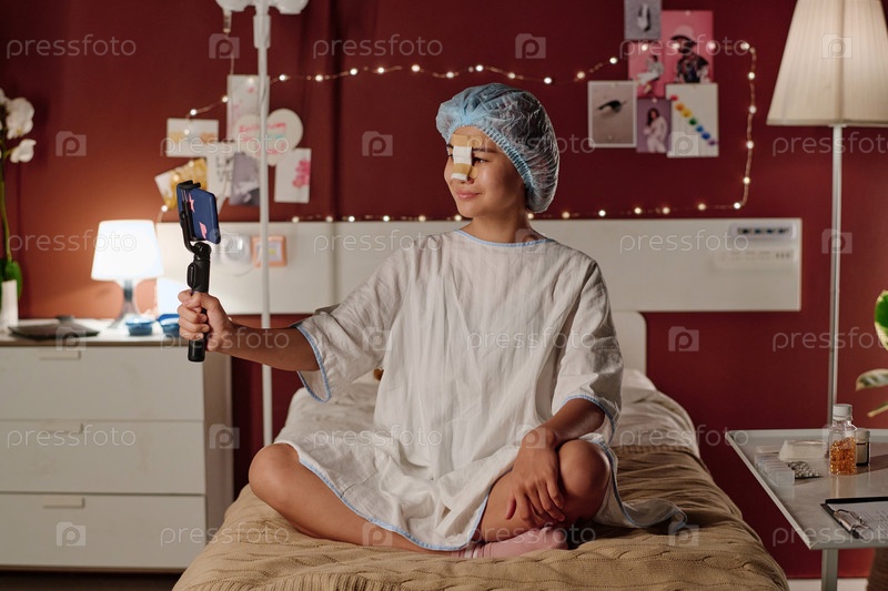 Счастливая девочка-подросток со смартфоном ведет прямую трансляцию в клиниках