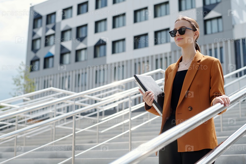 Молодая уверенная женщина-брокер или предприниматель в формальной одежде, несущая папки