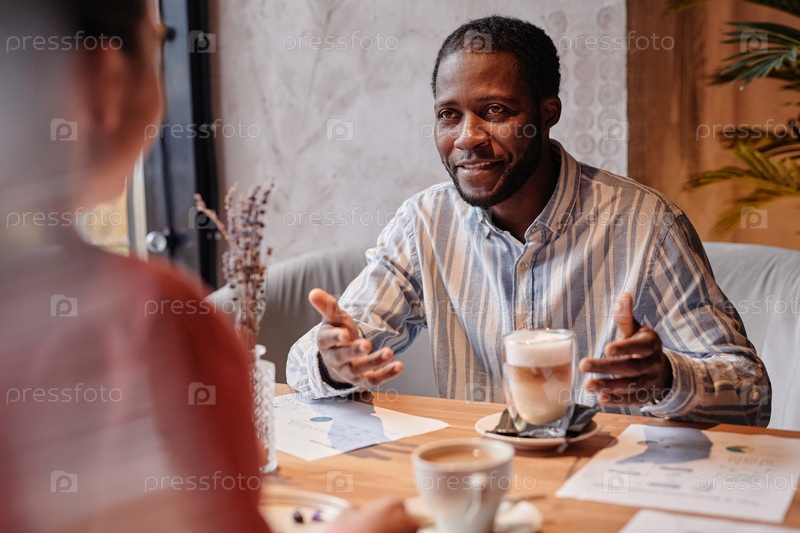 Молодой афроамериканский бизнесмен объясняет что-то коллеге