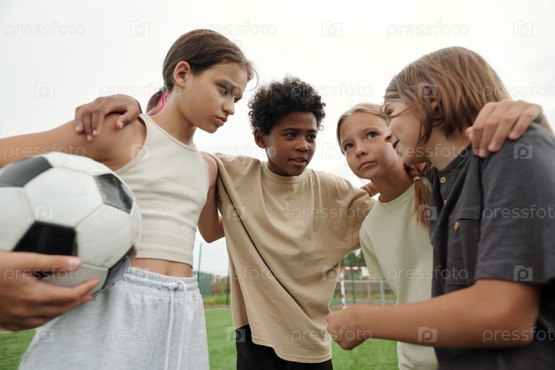 Футбольная команда из четырех милых межкультурных школьников консультируется о игре