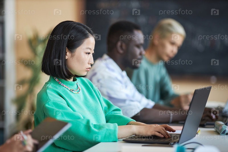 Молодая серьезная азиатская студентка в зеленом пуловере смотрит на экран ноутбука