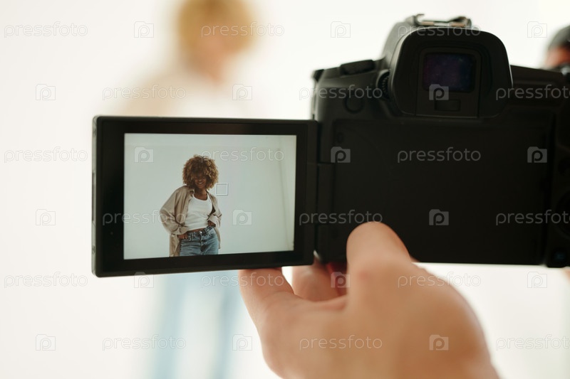 Экран фотокамеры с молодой афроамериканской женщиной в повседневной одежде