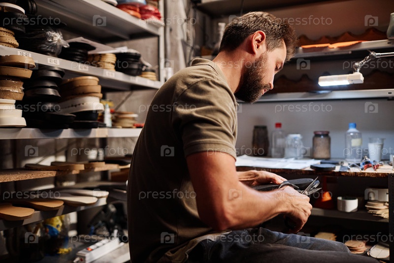 Боковой вид молодого человека в повседневной одежде, отрезающего концы подошвы ножницами
