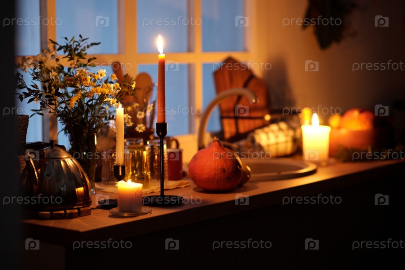 Три горящие свечи, чайник, спелая садовая тыква и букет белых цветов