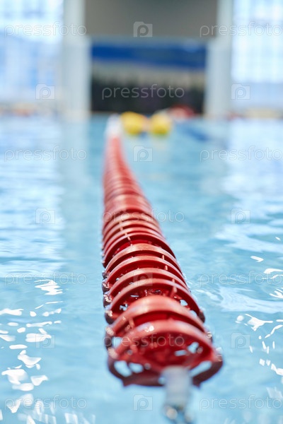 Сосредоточьтесь на красном пластиковом оборудовании для плавания, разделяющем бассейн на несколько линий