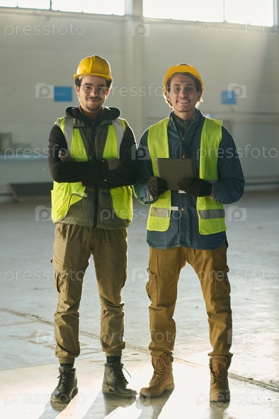 Счастливые молодые коллеги-мужчины в шлемах безопасности и отражающих жилетах