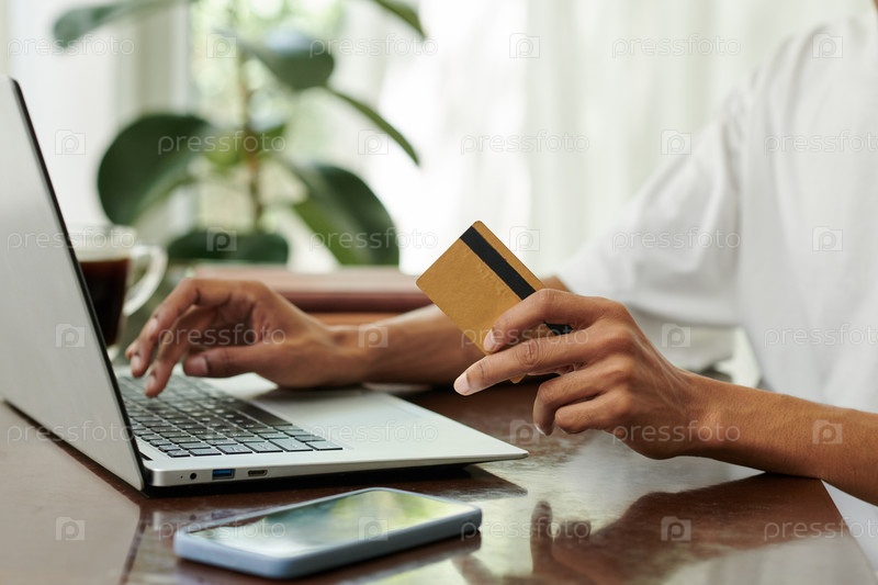 Руки молодого мужского клиента с кредитной картой, сидящего перед ноутбуком