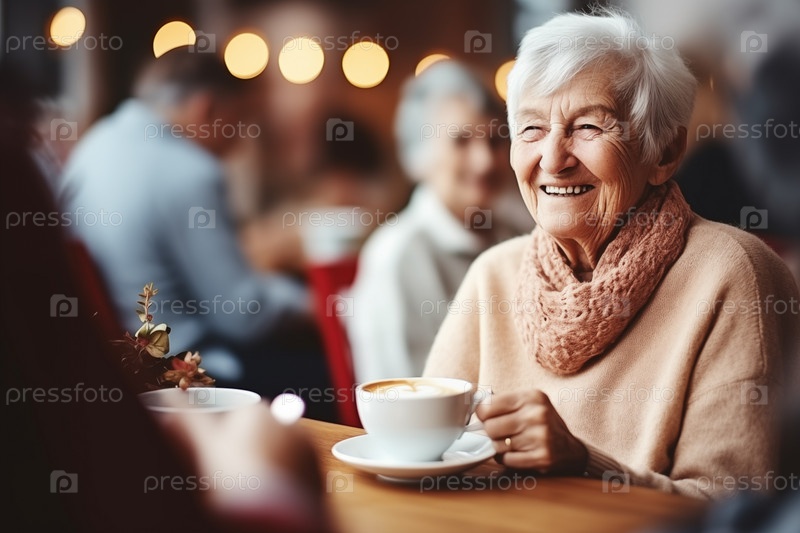 Пожилая женщина пьет кофе в кафе AI