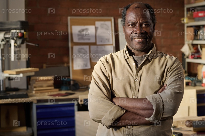 Старший чернокожий мужчина в роли плотника улыбается перед камерой