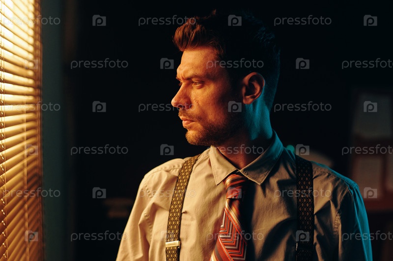 Серьезный молодой человек думает о чем-то и смотрит в окно