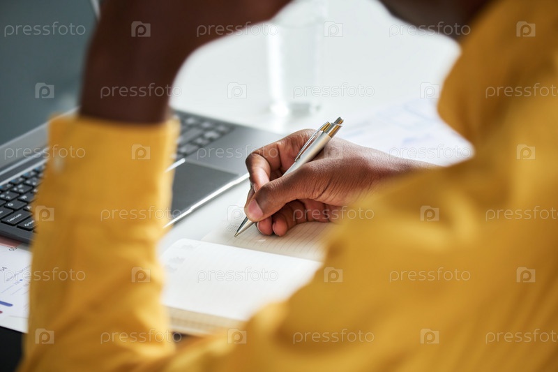 Рука молодого исполнительного директора или аналитика, делающего заметки в блокноте