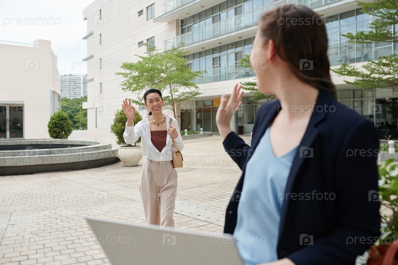 Деловая женщина, размахивающая коллеге по работе