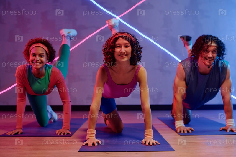 Спортсмены в ретро одежде согреваются в фитнес-центре