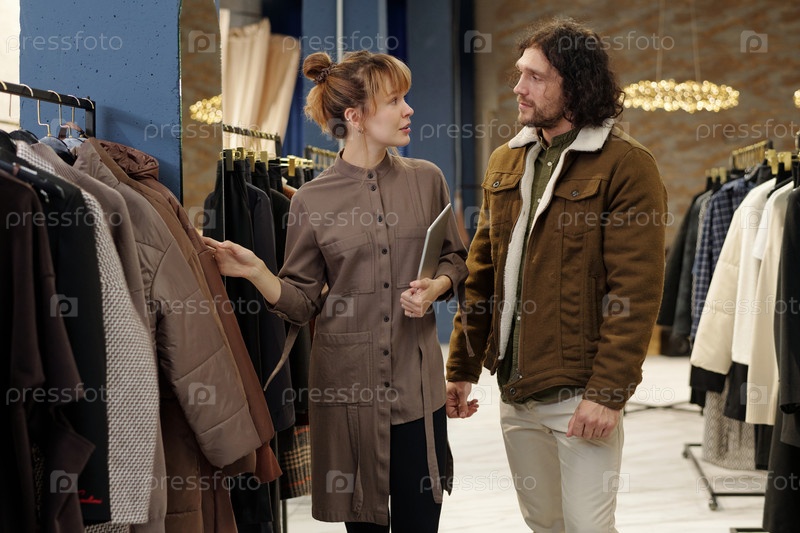 Молодая продавщица дает советы клиенту-мужчине в бутике