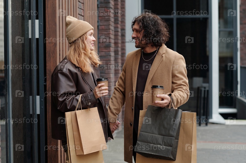 Счастливая молодая пара с бумажными пакетами, смотрящая друг на друга на открытом воздухе