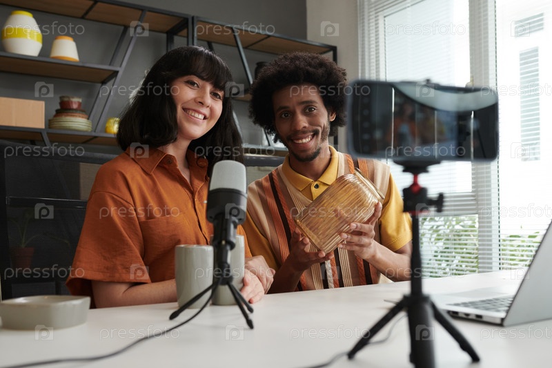 Молодой улыбающийся блоггер-мужчина показывает ручной вазу онлайн аудитории