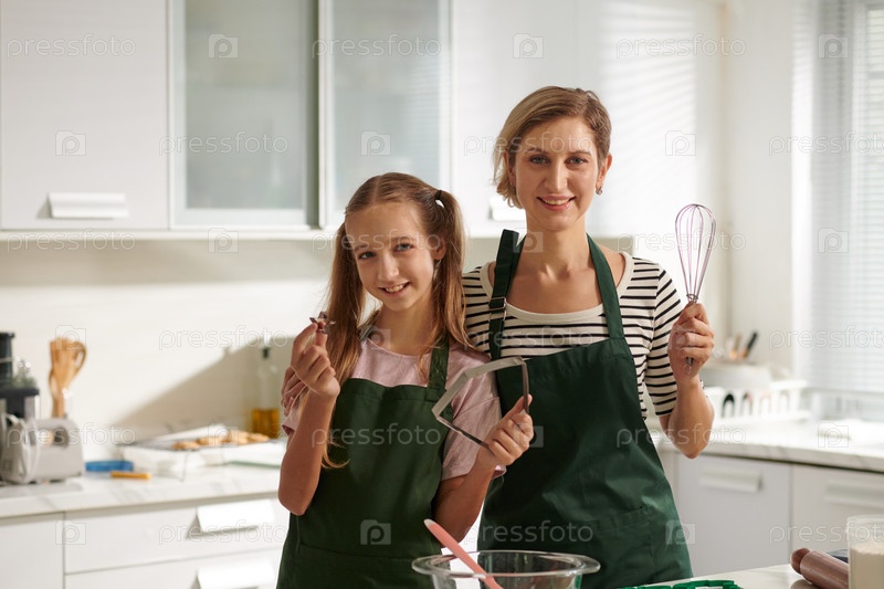 Мать и дочь показывают инструменты для выпечки