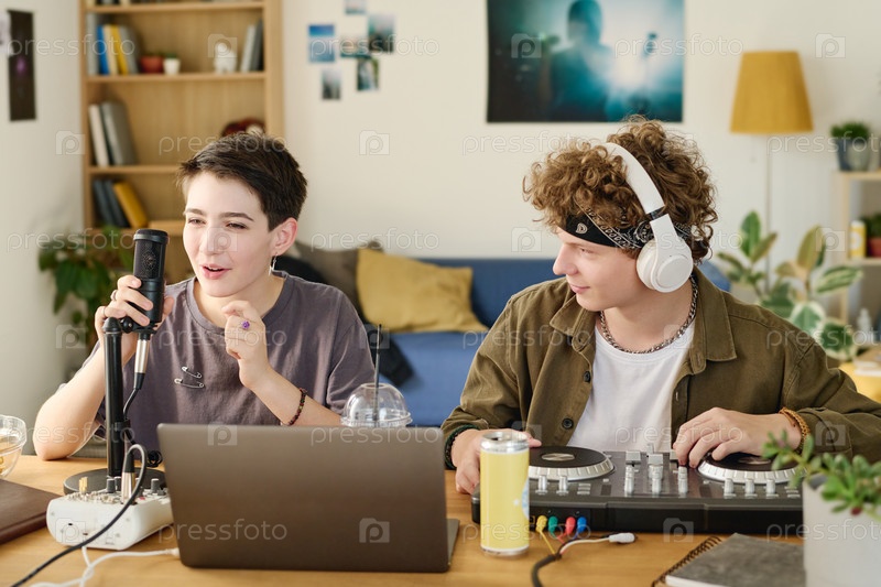 Подросток в наушниках смотрит на свою девушку, говорящую в микрофон