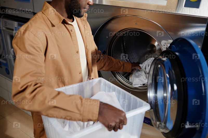 Обрезанный снимок молодого человека в бежевой рубашке, наполняющего барабан стиральной машины