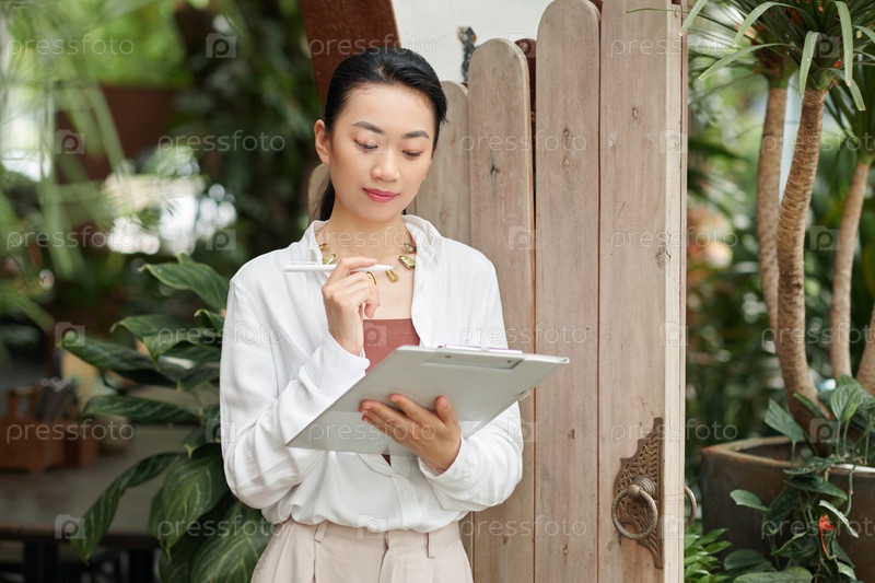 Азиатская бизнесвумен заполняет документ