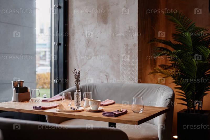 Уголок современного уютного кафе или ресторана с деревянным столом и двумя диванами