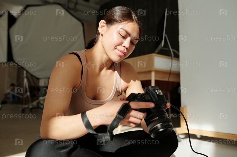 Молодая брюнетка в повседневной одежде смотрит на снимки модной модели