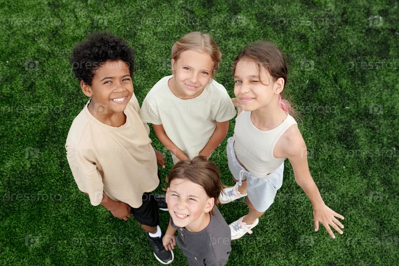 Четыре милых счастливых школьника в спортивной одежде, смотрящих на камеру
