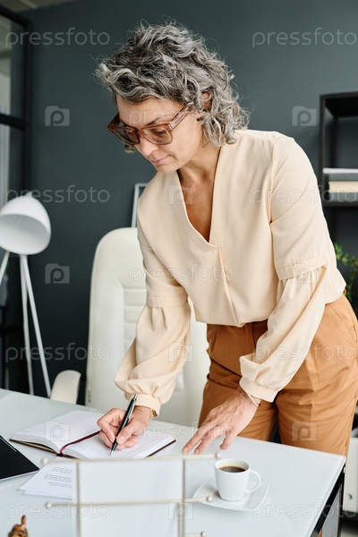 Зрелая начальница склоняется над рабочим местом с открытой тетрадью и делает заметки