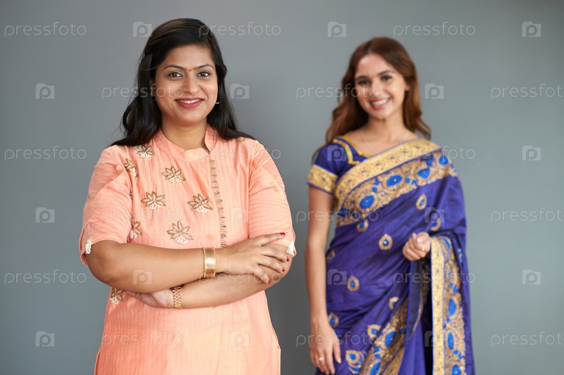 Веселые индийские женщины в традиционных платьях