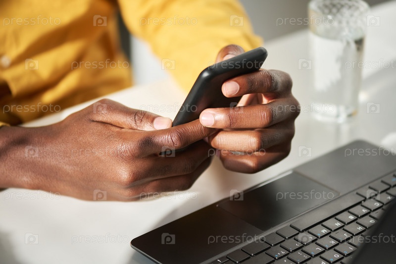 Руки молодого афроамериканского бизнесмена, держащего мобильный телефон
