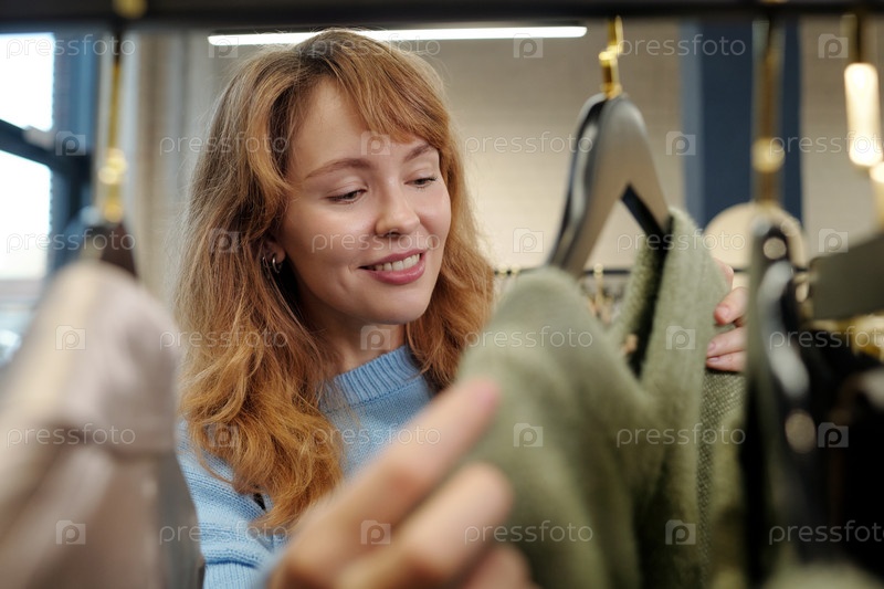 Счастливая молодая блондинка смотрит на новый пуловер на вешалки в бутике
