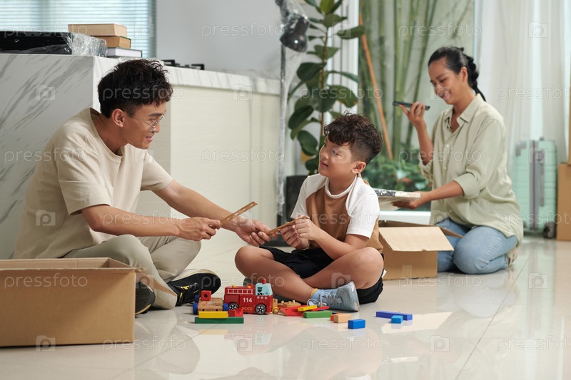 Отец и сын вынимают игрушки из коробки после переезда в новый дом