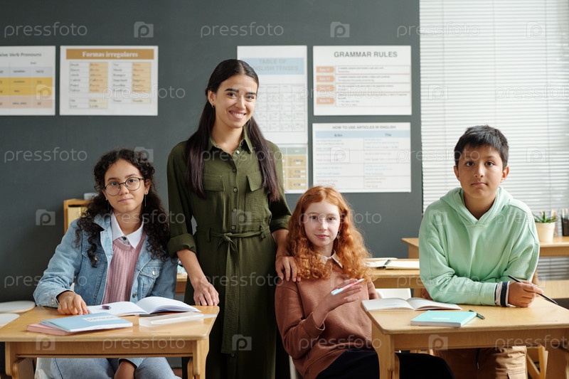 Молодая успешная учительница и группа усердных учащихся средней школы