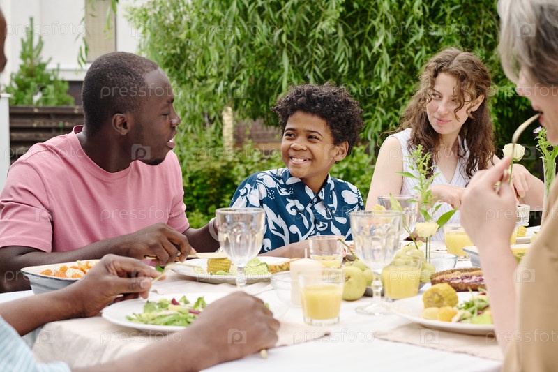 Молодая межкультурная пара смотрит на своего милого сына, разговаривающего с отцом