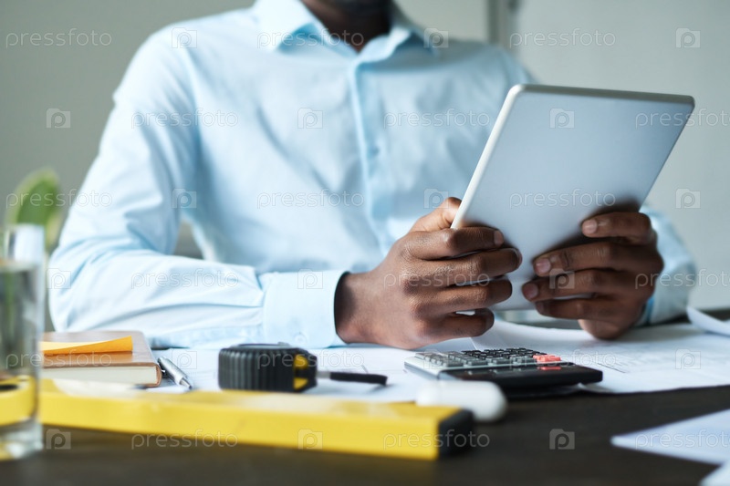 Обрезанный снимок молодого афроамериканского инженера-мужчины, держащего планшет