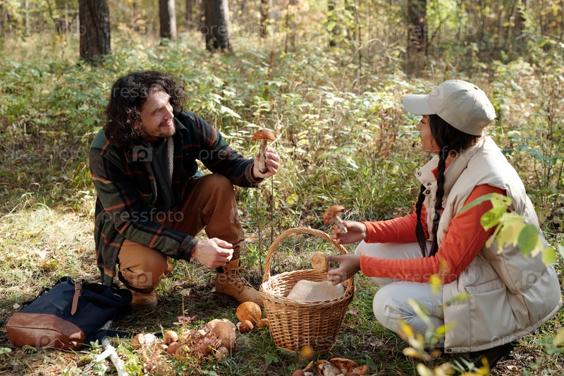 Молодой турист-мужчина с болетом в руке, смотрящий на свою жену