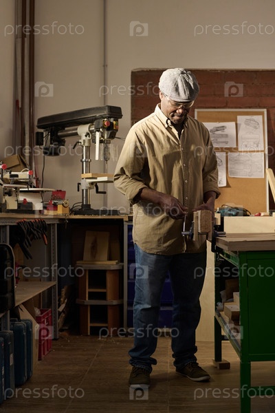 Чернокожий старший мужчина как квалифицированный плотник, стоящий в мастерской