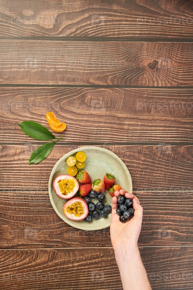Наполнение тарелки фруктами и ягодами